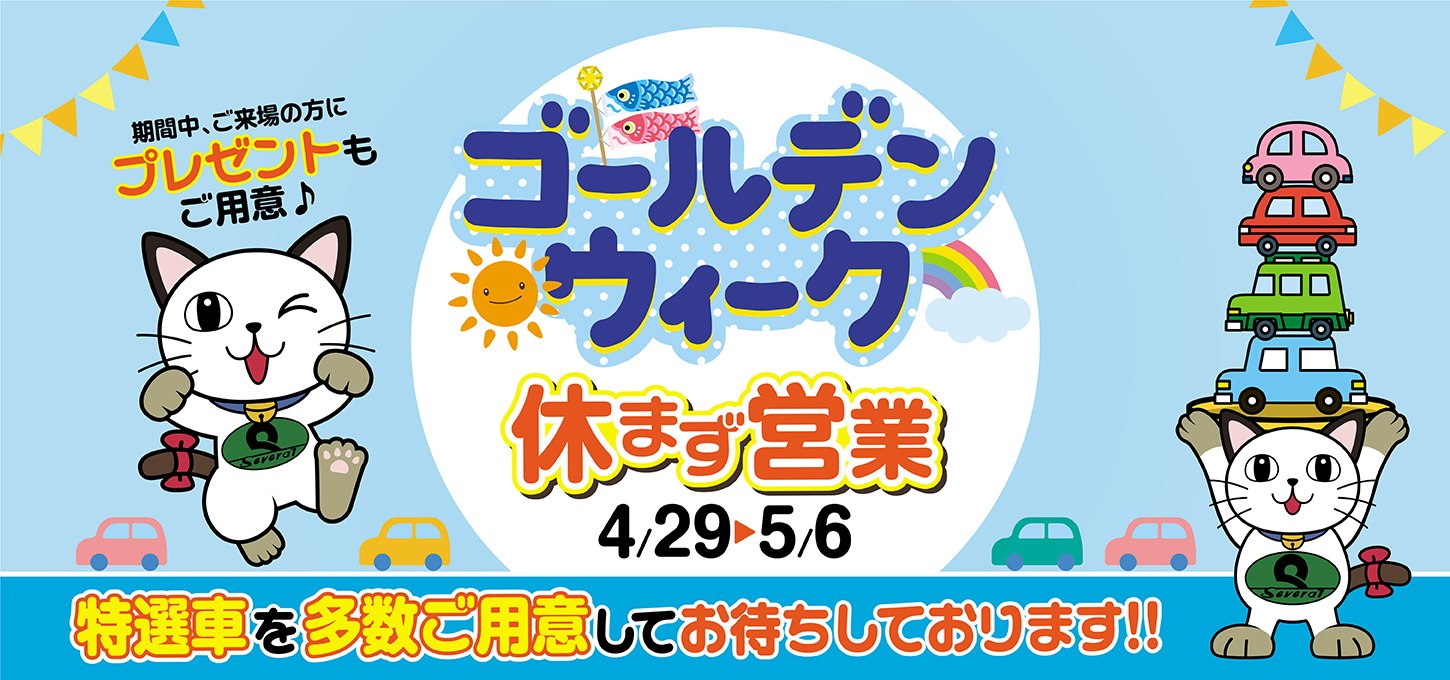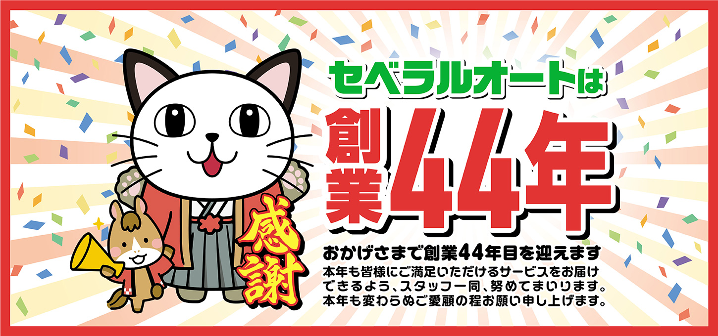 「セベにゃん」でお馴染みのセベラルオートです。新車、中古車、未使用車の販売から、車検・修理・整備・自動車保険まで、あなたのご家族まるごとサポート!何でもお気軽にご相談下さい。